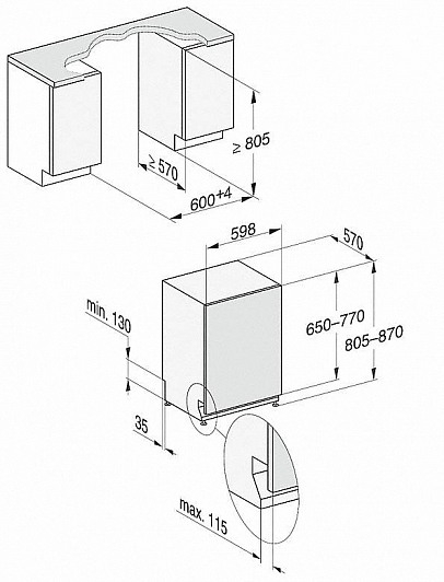 Общие характеристики:- Вид: полноразмерная- Тип установки: встраиваемая- Цвет: нержавеющая сталь- Вместительность: 14 комплектов посуды- Уровень шума: 44 дБ - Количество программ: 8- Количество температурных режимов: 5- Класс энергопотребления: А++- Класс мытья: А- Класс сушки: А- Сушка посуды: рециркуляционная сушка Turbothermic- Мощность подключения: 2,0 кВт- Расход воды на цикл: 6 л- Размеры (ВxШxГ): 80.5-87х59.8х57 см- Размеры ниши для встраивания (ВхШхГ): 80.5-87х60х57 см