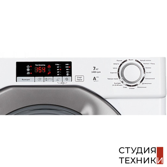 Управление, функции:- Электронное управление с поворотным переключателем - Цифровой дисплей- Отключение звука- Сигнал окончания стирки- Отложенный старт