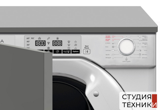 Управление:- Управление: электронное- Элементы управления: кнопки/поворотный программатор- Дисплей: жидкокристаллический цифровой с красными символами- Отсрочка старта 1-24 часа- Кнопка пропуска отжима- Автоматическая регулировка подачи воды