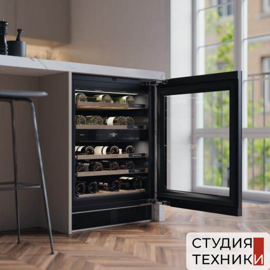 - Вид: винный холодильник- Расположение: встраиваемый- Дизайн-линейка: Elements- Количество температурных зон: 2- Тип охлаждения: компрессорное- Система размораживания: автоматическая- Количество полок: 3 шт - Количество бутылок: 38 шт- Общий полезный объем: 120 л - Цвет: черный - Уровень шума: 35 дБ- Мощность подключения: 1,1 кВт- Класс энергетической эффективности: A+- Годовое потребление энергии: 111 кВтч/год- Габариты (ВхШхГ): 82х59.5х57,3 см- Габариты ниши для встраивания (ВхШхГ): 82-87х60х58 см Управление, функции:- Сенсорное управление- Дисплей: цифровой- Регулировка теплоты и яркости освещения- Регулировка теплоты освещения- Автоматическое включение подсветки при открытии двери- Управление через приложение ConnectLife- Подключение к базе данных Vivino- Режим «Шаббат»