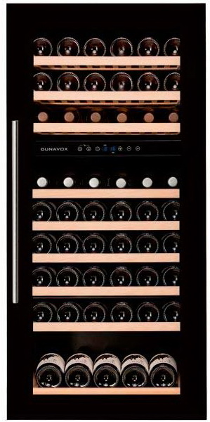 Винный шкаф Dunavox DAVS-72.185DB Общие характеристики:- Тип: встраиваемый- Вид: двухтемпературный- Количество камер: 1- Количество компрессоров: 1- Разморозка холодильной камеры: автоматическая- Полезный объем холодильной камеры: 185 л- Максимальное количество бутылок: 72- Цвет: черный- Уровень шума: 40 дБ- Класс энергетической эффективности: А- Годовое потребление энергии: 150 кВтч/год- Размеры (ВхШхГ): 123.4х59х56.3 см- Размеры ниши для встраивания (ВхШхГ): 123.4х59.56.3 см