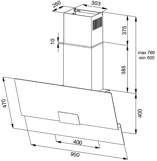 Общие характеристики:- Тип: наклонная- Монтаж: пристенная- Режим работы: отвод/рециркуляция- Уровень шума: 54 дБ- Цвет: черное стекло- Материал прибора: металл, стекло- Максимальная производительность: 550 м.куб/ч- Количество моторов: 1- Потребляемая мощность: 0,137 кВт- Диаметр воздуховода: 120/150 мм- Размеры (ВхШхГ): 50.1-76х90х38.5 см