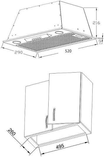 Общие характеристики:- Тип: встраиваемая- Монтаж: встраиваемая в шкаф- Режим работы: отвод/рециркуляция- Уровень шума: 50 дБ- Цвет: черный- Материал корпуса: нержавеющая сталь- Максимальная производительность: 450 м.куб/ч- Количество двигателей: 1- Потребляемая мощность: 0,220 кВт- Диаметр воздуховода: 120/150 мм- Размеры (ВхШхГ): 21.6х52х29 см- Вес: 5,2 кг
