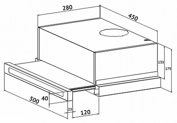 Общие характеристики:- Тип: вытяжка с выдвижным экраном- Монтаж: встраиваемая в шкаф- Режим работы: отвод/рециркуляция- Уровень шума: 58 дБ- Цвет: нержавеющая сталь/черный- Материал корпуса: нержавеющая сталь- Максимальная производительность: 600 м.куб/ч- Количество двигателей: 1- Потребляемая мощность: 0,185 кВт- Диаметр воздуховода: 120 мм- Размеры (ВхШхГ): 17.5х50х14.3-42.3 см- Вес:5,82 кг