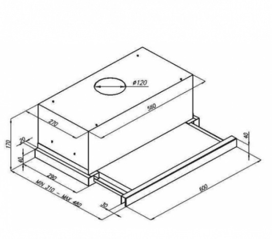 Общие характеристики: - Тип: встраиваемая- Установка: встраиваемая в шкаф- Режим работы: отвод/циркуляция - Уровень шума: 56/65 дБ- Цвет: белый- Максимальная производительность: 550 м.куб/ч- Мощность подключения: 115 Вт - Диаметр воздуховода: 120 мм- Размеры (ВхШхГ): 17х60х32 см- Размеры ниши для встраивания (ВхШхГ): 13х56х27 см